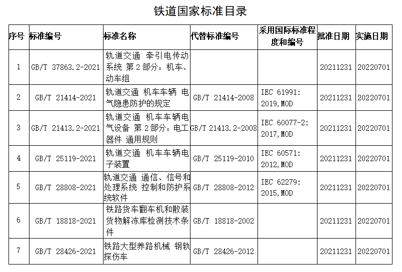 近日,由國家鐵路局組織編制的《軌道交通 牽引電傳動系統(tǒng) 第2部分:機車、動車組》等7項鐵道國家標(biāo)準(zhǔn),經(jīng)國家標(biāo)準(zhǔn)化管理委員會審批后正式發(fā)布。7項標(biāo)準(zhǔn)中新制定1項,修訂6項,將于2022年7月1日實施。該7項標(biāo)準(zhǔn)是中國鐵路技術(shù)標(biāo)準(zhǔn)體系的重要組成部分,其發(fā)布為鐵路產(chǎn)品的設(shè)計、制造、檢驗等提供了技術(shù)依據(jù),對保障鐵路運營安全和提高產(chǎn)品質(zhì)量將起到積極的作用。